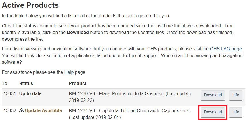 If you have purchased Canadian Hydrographic Service digital charts for navigation from a registered chart dealer, you can download updates and new editions from the CHS Digital Data Portal at any time for two years from the date of purchase. Log in to the portal and download updated charts from your Active Products list.